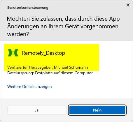 Das Fernservicemodul verfügt nur über eine ID, die bei jeder Sitzung neu vergeben wird. Bitte bestätigen Sie den dann folgenden Hinweis. ITC signiert seine Software mit einem gültigen Softwarezertifikat womit der Herausgeber verifiziert werden kann (siehe gelbe Markierung). Wenn hier ein unbekannter Herausgeber erscheint, stammt die Software nicht von uns und Sie sollten Remotely nicht ausführen.