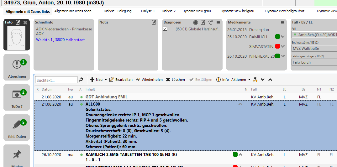 Sie können nun innerhalb des ITC Systems dokumentieren und aus dem aktuellen Visit über die PVS-Rückgabe Daten an Medical Office zurückgeben, die dort in der Akte gespeichert werden: